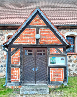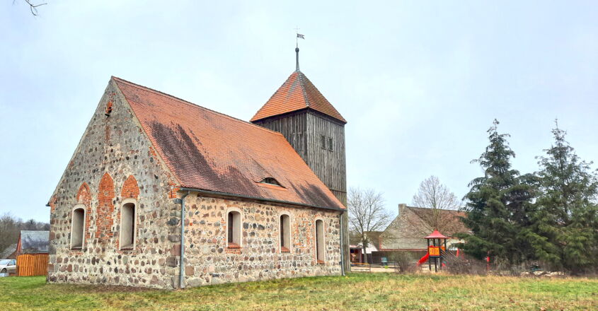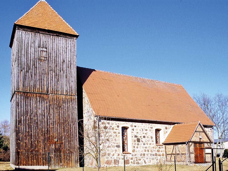 Flachgedeckter Feldsteinbau, Anfang 14. Jh., 1686 umgebaut, dabei Fenster korbbogig verändert und an der Südseite die Vorhalle in Fachwerk vor das gestufte Backsteinportal gesetzt. Westturm von 1686 (i), aus verbrettertem Fachwerk dicht vor der Westwand des Schiffes. In der Ostwand die ursprüngliche gestufte Dreifenstergruppe mit Backsteinlaibung noch zu erkennen. Instandsetzung des Schiffsdaches 1986, des Turmes 1989.