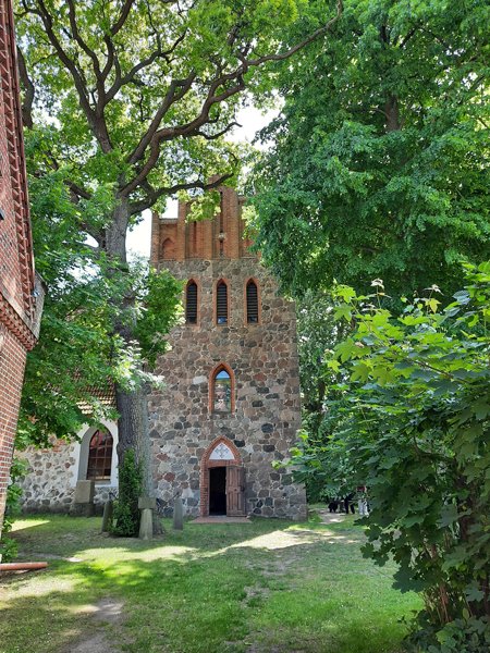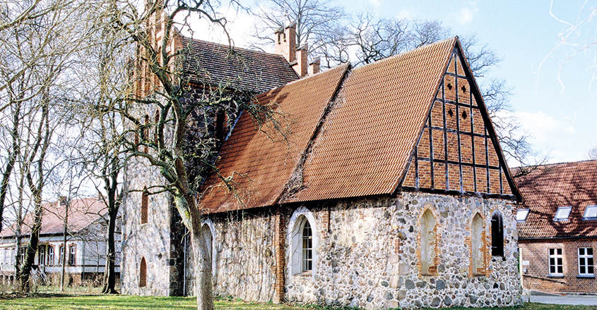 Flachgedeckter spätgotischer Feldsteinbau, 1865 erneuert mit Westquerturm unter Satteldach zwischen Stufengiebeln aus Backstein. Die Kanten des Schiffs und die Fensterlaibungen ebenfalls in Backstein, an der Nordseite ein zugesetztes, gestuftes Portal.