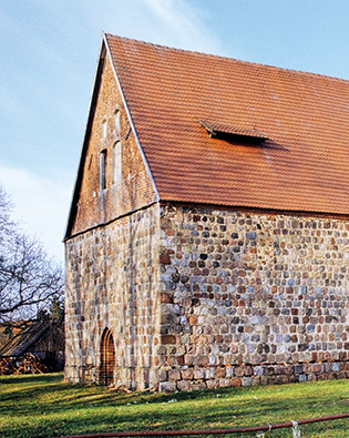 Frühgotischer Feldsteinquaderbau von 1276 (d). Die Portale an Nord- und Südseite aus Backstein, mit starken Rundstabprofilen wechselseitig glasiert/unglasiert. Der umlaufende Sockel ebenfalls mit glasierten Formsteinen. Die Ostwand mit hoher, gestaffelter Dreifenstergruppe, in den Giebel hinaufreichend mit Spitzbogenblenden und Blendenkreuz. In Nord- und Südwand je vier bauzeitliche Spitzbogenfenster. Die Sakristei im Nordosten abgebrochen. Vom schiffsbreiten Westturm nur das Untergeschoss ausgebaut. Das Dachwerk mit Inschrift von 1623 (i) in Kiefernholz mit Spitzsäulen und Mittelunterzug, die Streben und Kehlbalken geblattet. Instandsetzung von Dach und Fassade 1992.