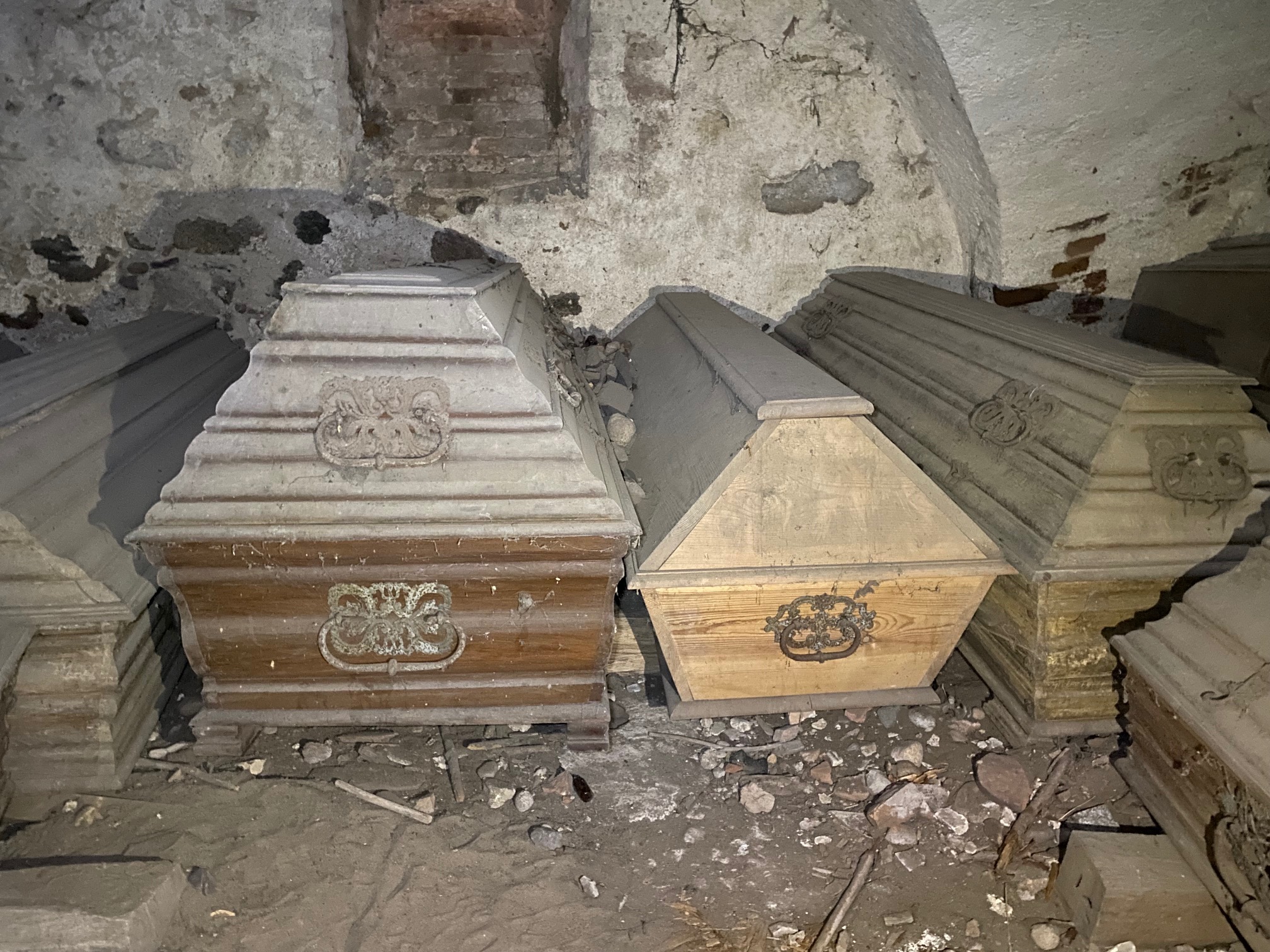 In der Gruft unter dem Ostteil der Kirche befinden sich 15 Holzsärge, darunter drei Kindersärge; ein weiterer Sarg könnte der Größe nach ebenfalls zu einem Kind oder Jugendlichen gehören. Die Särge lassen sich bislang nicht namentlich zuordnen, Inschriften sind nicht vorhanden. Eine erste kunsthistorische Ansprache macht eine zeitliche Einordnung vom frühen 18. bis ins frühe 19. Jahrhundert plausibel; einer der Särge könnte auch noch ins 17. Jahrhundert datieren.