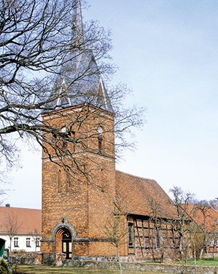 Fachwerkbau mit polygonalem Chorschluss und nördlicher Vorhalle, Inschrift von 1712 (i), Dachwerk von 1713 (d). Westwand und eingezogener Westturm 1893 in Backstein. Fenster nachträglich um ein Gefach nach unten verlängert.