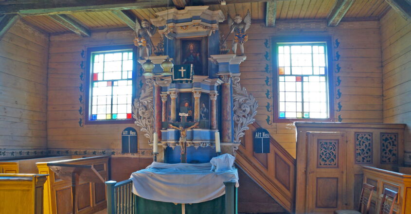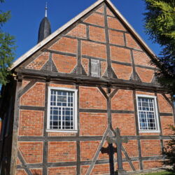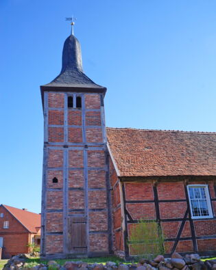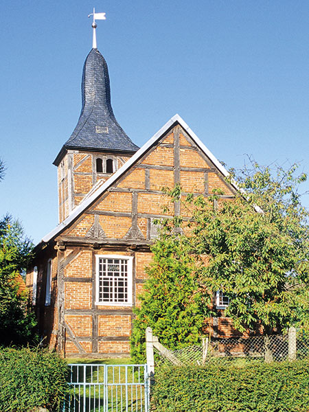Fachwerkbau mit quadratischem Westturm, im Kern von 1591 (d). Barocke Instandsetzung und Erneuerung 1712. Der Turm mit verschieferter Dachhaube 1905 verändert. Der Ostgiebel mit rosettenverzierten Fußstreben über den vorkragenden Gesimsbalken, ähnlich den Fachwerkbauten in Tüchen und Grube.