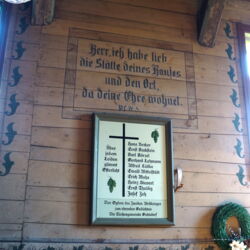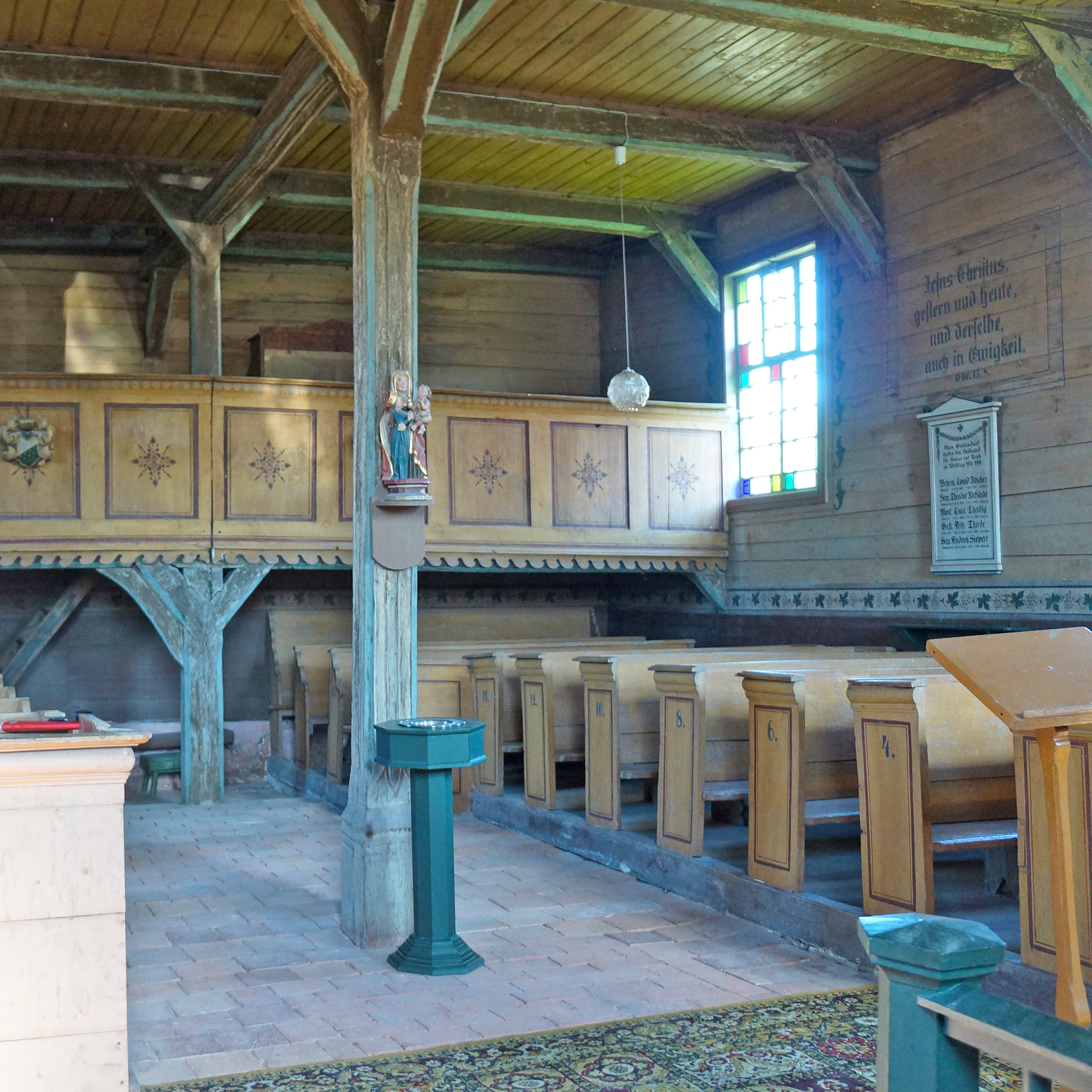 Innen mit profilierter Balkendecke, Mittelpfeiler und Unterzug. Spätgotische Schnitzfigur der hl. Anna selbdritt, restauriert 1937. Kanzelaltar von 1712 und Fenster mit kleinen barocken Wappenscheiben, u.a. der Familie von Wartenberg.