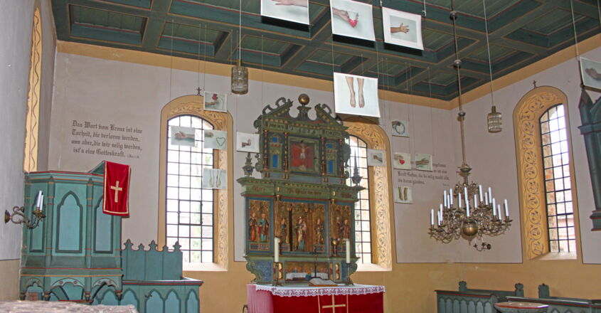 Die Ausstattung größtenteils 2. Hälfte des 19. Jahrhunderts. Im Altaraufsatz von 1624 zentral Maria mit Kind (1902) sowie sechs spätgotische, nicht zusammengehörige Schnitzfiguren mit z.T. falsch ergänzten Attributen: Heilige Katharina und Heilige Barbara (um 1430), Paulus, Johannes, Bischof und Ministrant mit Weihrauchfass und Buch (um 1470), insgesamt 1902 überarbeitet und neu gefasst. Im Auszug Kruzifix, in der Predella Abendmahlsgemälde.
