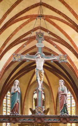 Ende 14. Jh. innen weiterer Ausbau mit bilder- und figurenreichem Sandsteinlettner, mit seitlichen Chorschranken und mittig stehendem Kreuzaltar. Bedeutende Glasmalereien aus dem frühen 15. Jh. in sechs der Nordfenster. Glasfenster im Chor von 1890–95.