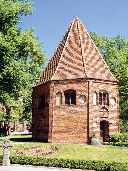 Achteckiger Zentralbau in Backstein, Anfang 16. Jh. Abschluss mit steilem achteckigen Zeltdach. Die zweigeteilten Fenster und das Südportal segmentbogig, die Fenster flankiert durch Kreisblenden und Segmentbogenblenden.