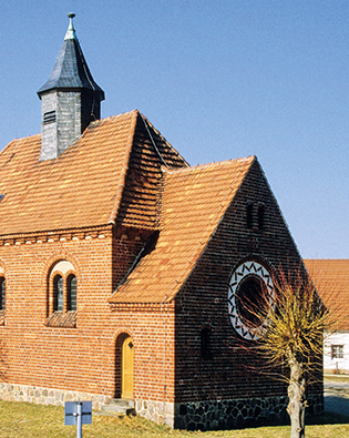 Neuromanischer Backsteinbau von 1908, der Chorschluss in Gebäudebreite, mit Rundfenster. Oktogonaler verschieferter Dachturm.