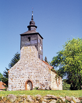 Feldsteinbau, Anfang 14. Jh., ursprünglich holztonnengewölbt, später flachgedeckt. Über dem Westgiebel hölzerner Dachturm mit verschiefertem Aufsatz und barocker Schweifhaube. In West- und Südwand Portale mit Gewänden in Backstein, in der Ostwand ein zugesetztes Mittelfenster mit eingemauerten mittelalterlichen Schalltöpfen in der Laibung zwischen den Lanzettfenstern.