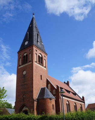 Flachgedeckter neugotischer Backsteinsbau von 1904 mit eingezogenem Westturm und Sakristei im Osten, anstelle eines mittelalterlichen Baues.