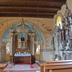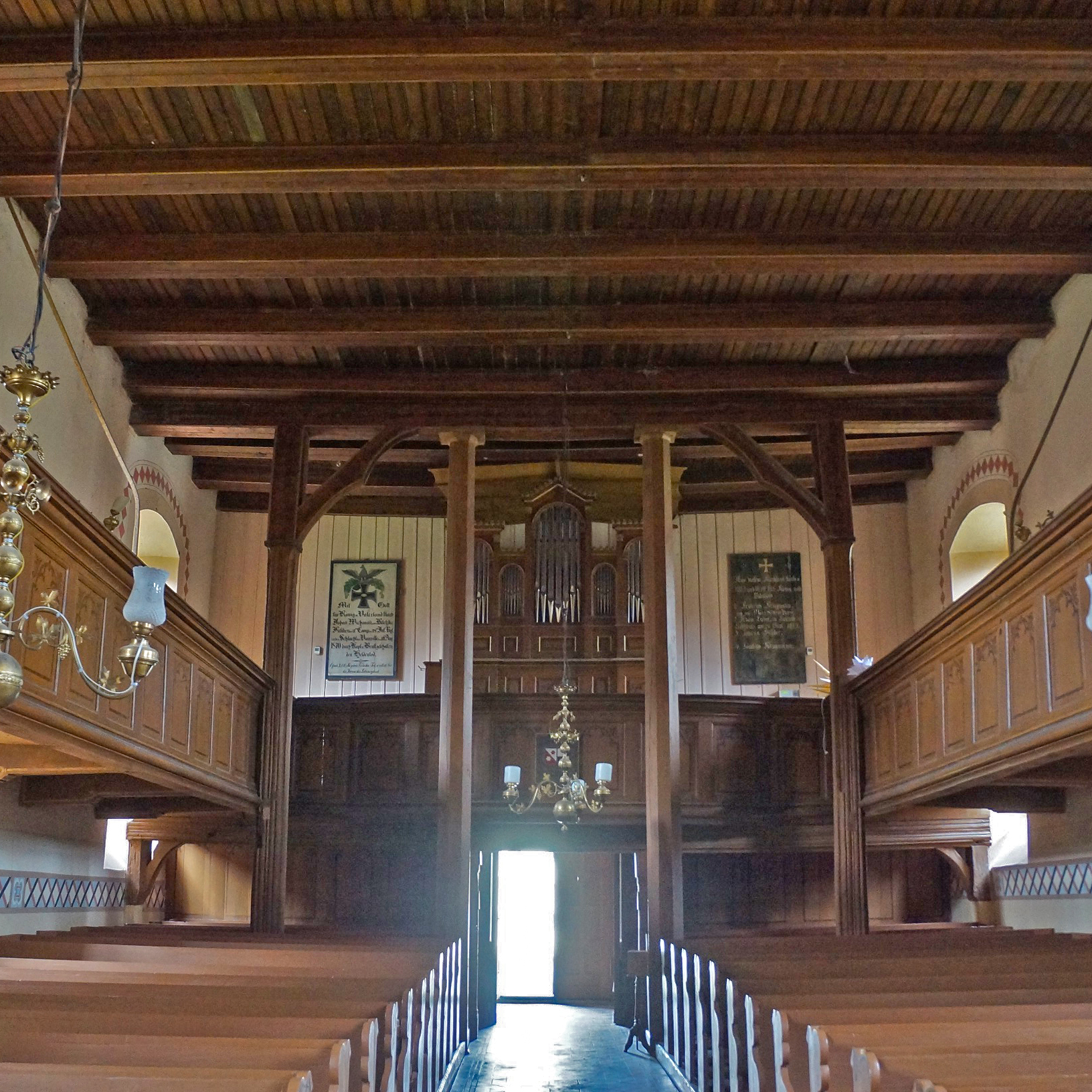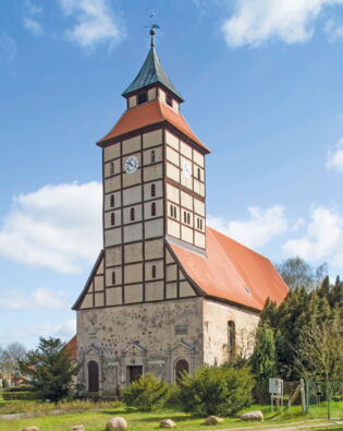 Flachgedeckter Feldsteinbau mit Apsis, Mitte 13. Jh. Vor 1300 die Stufenportale der Nordseite, das Schiffsportal mit Glasursteinen profiliert, die Portale zugesetzt. Die frühgotischen Fenster mit Backsteinbögen gut erkennbar. Im frühen 17. Jh. das Kirchenschiff erhöht, mit zweigeschossigem Fachwerkturm von 1601 (d) verlängert, Teil-erneuerung im 19. Jh. Die Westseite als Schaufassade im Stil der Spätrenaissance. Instandsetzung der Dacheindeckung des Kirchenschiffes 2013, des Innenraumes 2011.