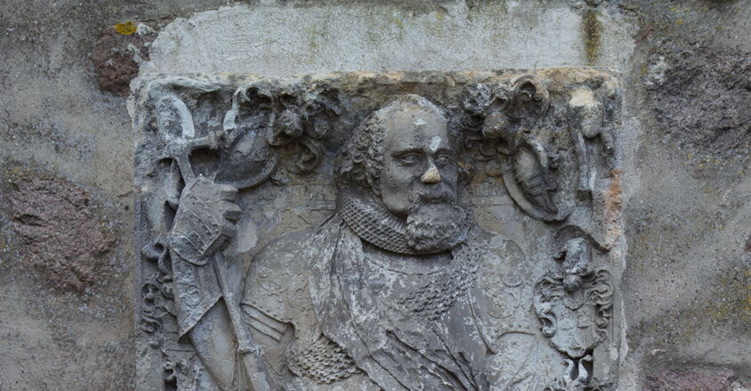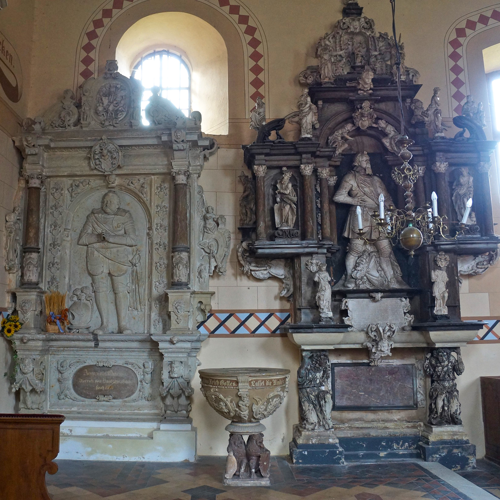 Neben dem Westportal zwei figürliche Grabsteine für den 1605 verstorbenen Achatz von Quitzow und seine Ehefrau R. von Münchhausen sowie für den nach 1580 verstorbenen Christopher von Quitzow.