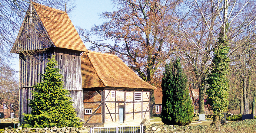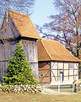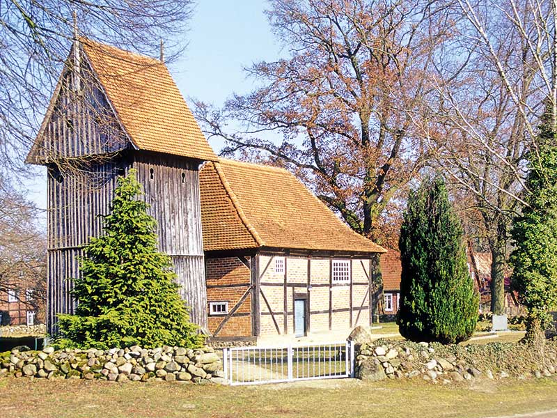 Fachwerkbau von 1687 (Inschrift am Türsturz), mit breiten Gefachen und Walmdach. Neubau nach dem Dreißigjährigen Krieg. Im Westen freistehender Glockenturm von 1547 (d), leicht geböscht und verbrettert, mit kreuzverstrebten Ständern und Satteldach, über kerbschnittverzierten Knaggen auskragend.