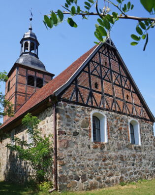 Spätgotischer Feldsteinbau von 1498 (d). Der Westquerturm Anfang 16. Jh., über dem vorgezogenen Satteldach als Fachwerkturm weitergeführt, mit geschweifter und verschieferter barocker Haube und offener Laterne. Der Ostgiebel in Zierfachwerk von 1582 (d). Die Fensteröffnungen barock erweitert, mit erhaltenen Resten der alten Laibungen in Backstein. In der Nordwand stichbogiges Portal in Spitzbogenblende.