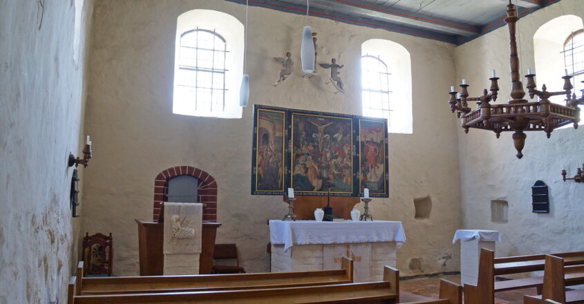 Instandsetzungen erfolgten von 1998–2004. Der Innenraum flachgedeckt, 1966 restauriert. Flügelaltar mit Tafelmalerei von 1558 (i). Die Westempore im Renaissancestil von 1579, neuzeitlich verändert.