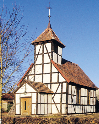 Kleine rechteckige Fachwerkkirche von 1794 mit quadratischem Dachreiter über dem Westgiebel; die Westvorhalle um 1900. Kanzelaltar, zusammengesetzt aus den Flügeln eines spätgotischen Schnitzaltars, Ende des 15. Jahrhunderts und einem dreiseitigen spätbarocken Kanzelkorb, 1942 bemalt.