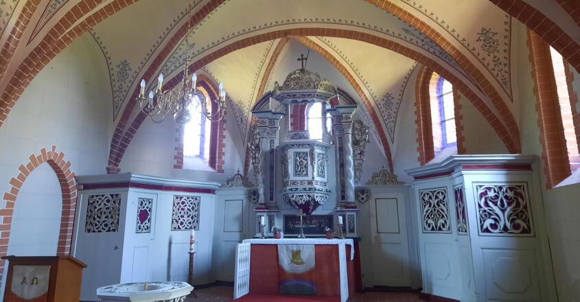 Innen reich geschnitzter Kanzelaltar, Anfang 18. Jh., seitlich von Betstübchen flankiert. Orgel 1892 von Carl Joseph Chwatal aus Merseburg, restauriert 1964 durch Hans Voit aus Rathenow und 1995 durch Alexander Schuke aus Potsdam.
