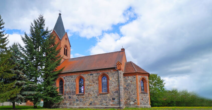 Neugotischer Feldsteinbau mit polygonalem Chorschluss im Osten und eingezogenem Backsteinturm von 1878 im Westen. Die Kanten und abgestuften Laibungen der spitzbogigen Fenster in Backstein. Ersatz für einen Vorgängerbau in Fachwerk. Innen eine Barockkanzel von 1708.
