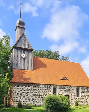 Spätbarocker Saalbau aus Feldstein; der westliche Querturm nicht ausgebaut, barock verbretterter Fachwerkaufsatz. Wohl gleichzeitig die Fensteröffnungen stichbogig verändert. 1860 eingreifend restauriert, dabei Ostgiebel und Westportal erneuert. Innen großer Spitzbogen zwischen Turmhalle und Schiff, z. T. vermauert. Westempore mit Orgel von 1858.