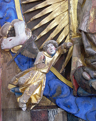 Innen spätgotischer Schnitzaltar, 1. Viertel 16. Jh. Im Schrein Madonna in der Strahlengloriole, in den Seitenflügeln Heilige in zwei Reihen übereinander, stilistisch durch fränkischen Riemenschneiderkreis beeinflusst. Gestühl von 1579 mit ausgeschnittenen Bankwangen.