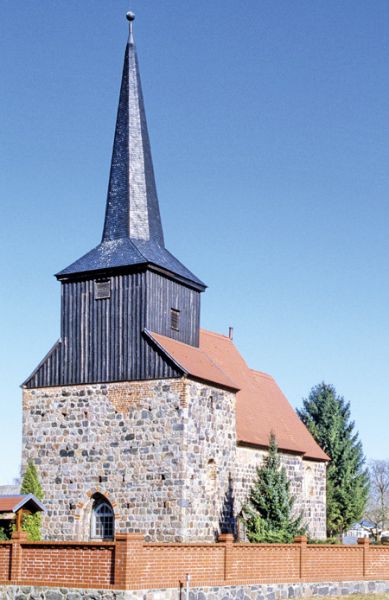 Saalbau aus Feldsteinquadern mit kurzem, eingezogenen Rechteckchor und schiffsbreitem Westturm, Mitte des 13. Jahrhunderts, der Turm wohl Anfang des 19. Jahrhunderts durch einen quadratischen verbretterten Fachwerkaufsatz mit steiler Schieferspitze erhöht.
