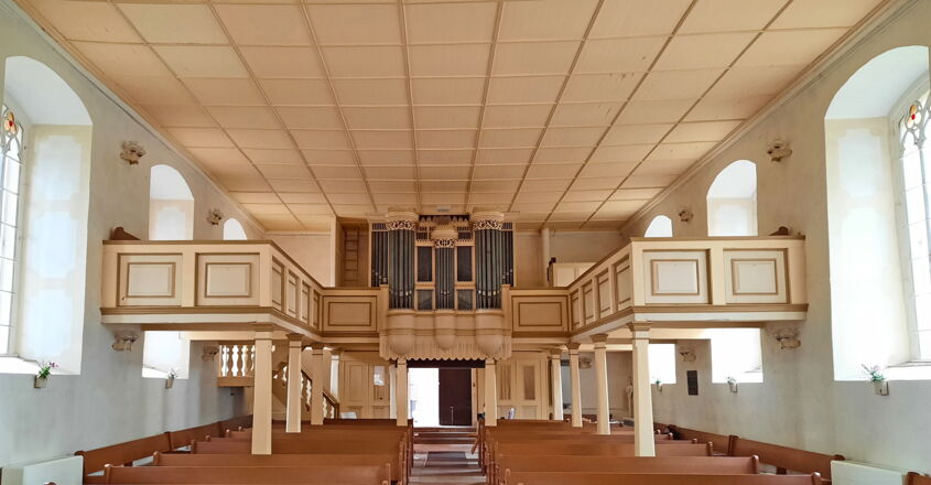 Innen dreiseitige Empore von 1752. Grabstein für den 1589 verstorbenen Helmut von Rohr.