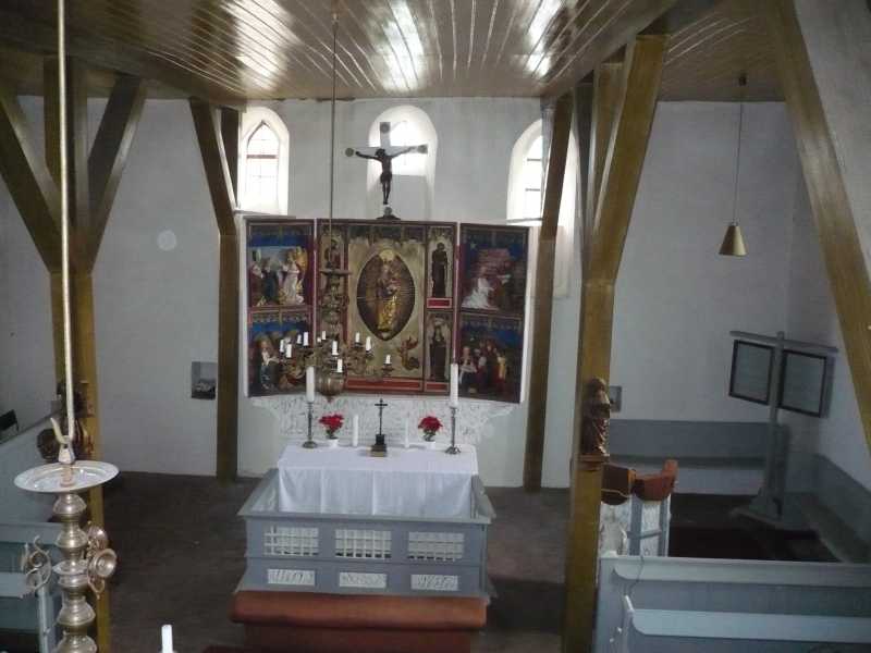Den noch aus katholischer Zeit stammenden geschnitzten Flügelaltar ziert als Mittelstück, eine Maria im Strahlenkranz. In den unmittelbar sich daneben befindlichen schmalen Feldern stehen an jeder Seite zwei Figuren übereinander: