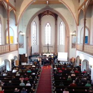 Das Friedenskonzert in der Evangelischen Kirche war begleitet mit musikalischen Einlagen, zwischen den verschiedenen Stücken gab es kürzere Reden von Schülern und auch Videos zum Thema. Musikalisch umrahmt wurde die Veranstaltung von der Gospelgesangsgruppe des Marie-Curie-Gymnasiums mit dem Musiklehrer Mario Geidel und der Schulpfarrerin Melanie Deckstrom.