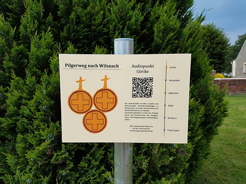 Pünktlich zum Ferienbeginn befinden sich nun am Pilgerweg, der von Berlin nach Bad Wilsnack führt, auf der Strecke zwischen Görike und Groß Leppin sechs Schilder, auf denen via QR-Code jeweils ein Audiopunkt abrufbar ist. Scannt man den Code öffnet sich eine Internetseite, auf der die jeweilige Audiodatei abgespielt wird. Pilger_innen und Besucher_innen der Region sind so eingeladen etwas über den Ort zu hören oder einen spirituellen Impuls auf ihrem Weg zu erhalten. Die Inhalte wurden von Menschen aus der Region erarbeitet und mit Liedern des Vehliner Gospelchores, des Glöwener Posaunenchors und des Göriker Dorfchores musikalisch ausgestaltet. Probieren Sie es selbst! Sollten Sie kein Smartphone haben, dann fragen Sie ihre Freunde oder Verwandte.