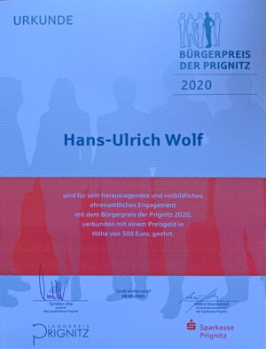 Hans-Ulrich Wolf aus Blüthen wurde für sein ehrenamtliches Lebenswerk, insbesondere den Aufbau des europaweit einzigartigen Pfarrhausmuseums in Blüthen mit dem Bürgerpreis der Prignitz geehrt.