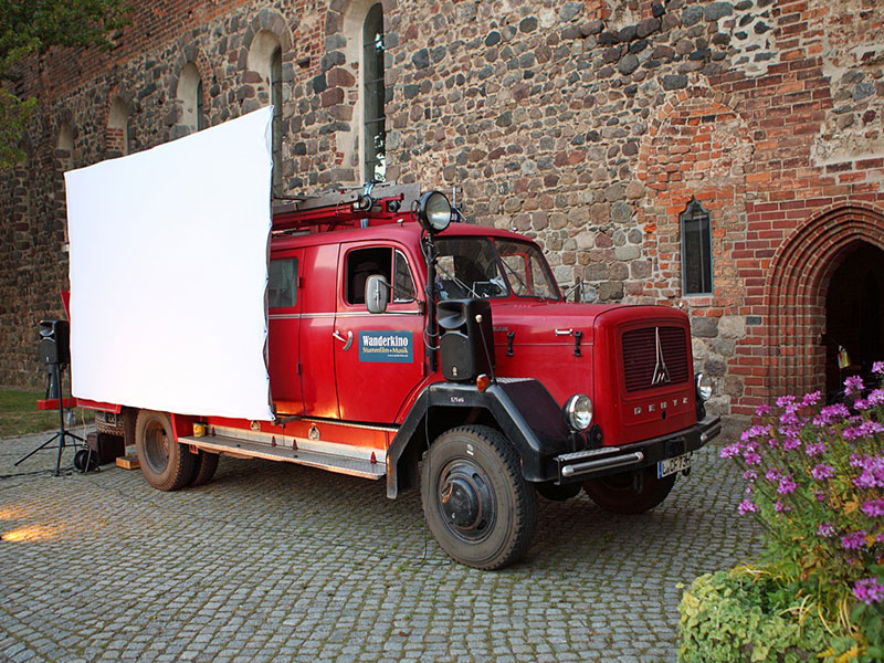 Das WANDERKINO ist seit 1999 in ganz Europa unterwegs. Mit 16mm-Projektionstechnik werden Stumm- und Tonfilme unterschiedlicher Genres (Slapstick-Komödien, Monumentalfilme, Independent-, Avantgarde-, Experimentalfilme) gezeigt. Ein Oldtimer-Feuerwehrauto - Magirus Deutz, Baujahr 1969 - ist hierfür eine wunderbare Veranstaltungskulisse und das ideale Reisemobil.