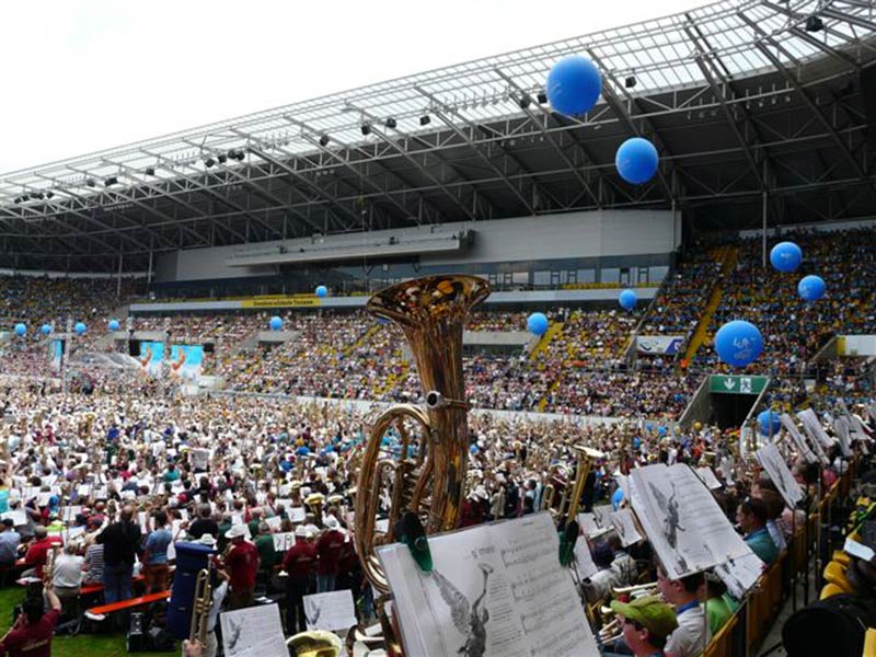 Musikalischer Höhepunkt war am Samstagabend die Serenade unter freiem Himmel an beiden Elbufern mit allen Blasmusikern und mehreren Tausend Zuhörern. Zum Abschlußgottesdienst am Sonntag im DVV-Stadium versammelten sich alle Bläser und die große Gottesdienstgemeinde, die das breite musikalische Spektrum der Bläserarbeit erleben konnten.