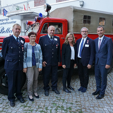 Innenminister Karl-Heinz Schröter zeichnete am Freitag 66 Bürgerinnen und Bürger für hervorragende Verdienste und entschlossenes Verhalten im Einsatz mit dem Ehrenzeichen im Brand- und Katastrophenschutz des Landes Brandenburg aus.