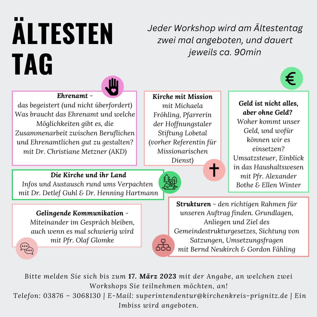Bitte melden Sie sich bis zum 17. März 2023 im Kirchenkreis mit der Angabe, an welchen zwei Workshops Sie teilnehmen möchten, an!
