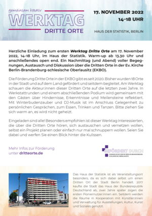 Herzliche Einladung zum ersten Werktag Dritte Orte am 17. November 2022, 14–18 Uhr, im Haus der Statistik. Warm-up ab 13:30 Uhr und anschließendes open end. Ein Nachmittag (und Abend) voller Begegnungen, Austausch und Diskussion über die Dritten Orte in der Ev. Kirche Berlin-Brandenburg-schlesische Oberlausitz (EKBO).
