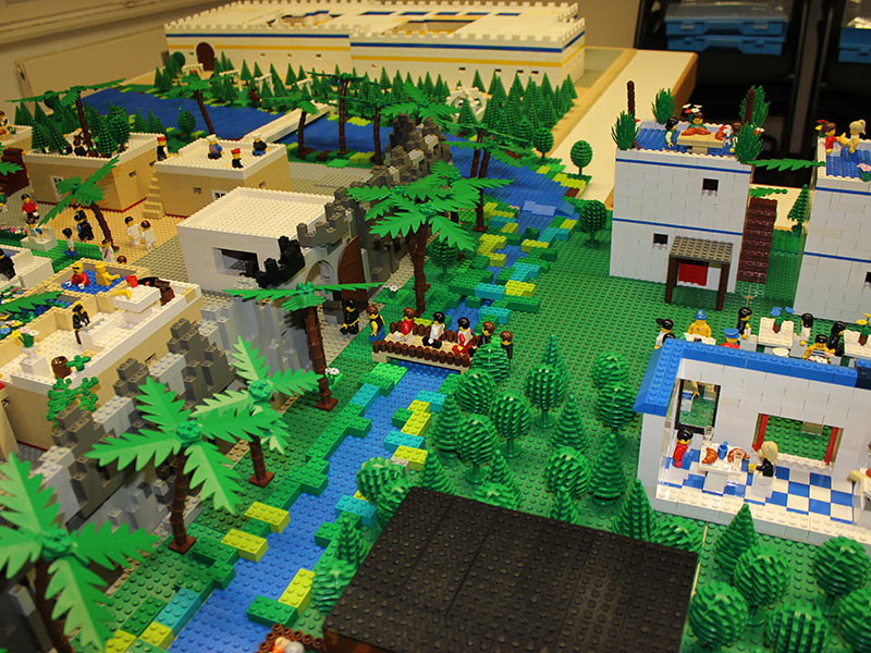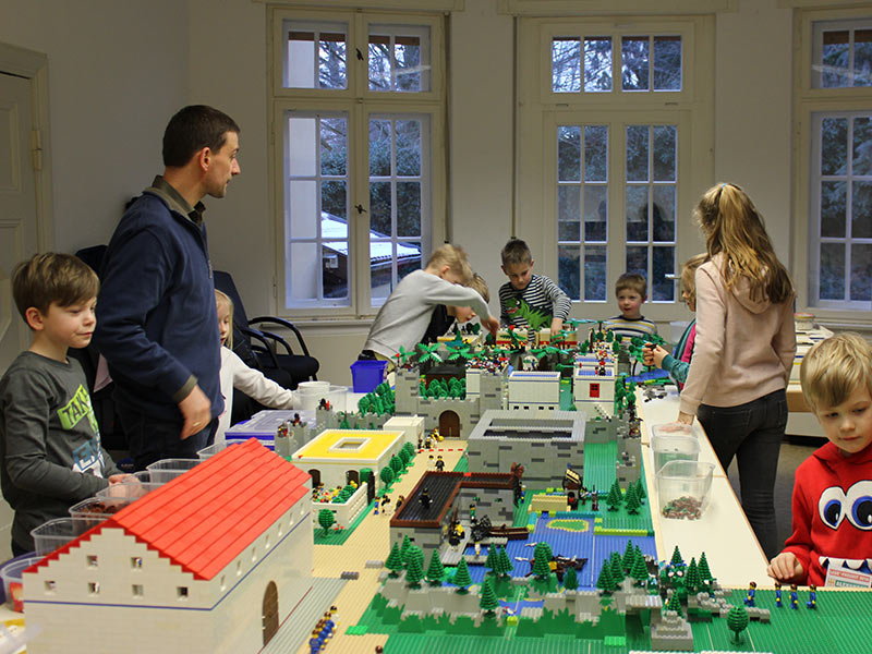 Innerhalb einer Woche hörten und erlebten die Kinder mit ihm die biblischen Geschichten – mal mit Bechern, mit Gläsern und Konserven oder mit handgefertigten Figuren – und bauten diese mit LEGO® nach. Am Ende der Woche entstand so eine riesige Erzähllandschaft. Nebenbei lernten die Mädchen und Jungen Lieder und Texte eines kleinen Musicals über den verlorenen Sohn kennen, welche wir am Sonntag im Familiengottesdienst zusammen mit der neuen Band von Dorothea Uibel aufführten. Anschließend waren alle Besucher eingeladen, die Erzähllandschaft zu bewundern.