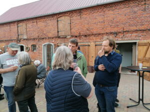 Ein leckerer Mittagshalt folgte auf dem Hof des Betriebes Landgeschmack in Görike, die auch Pächter der Kirchengemeinde Görike sind. Es schmeckte die hofeigene Bratwurst vom Grill! Und dann gab es noch eine Führung zu Kirchenlandflächen am Friedhof durch die Pächterin und einen regen Austausch zur Landwirtschaftspolitik.