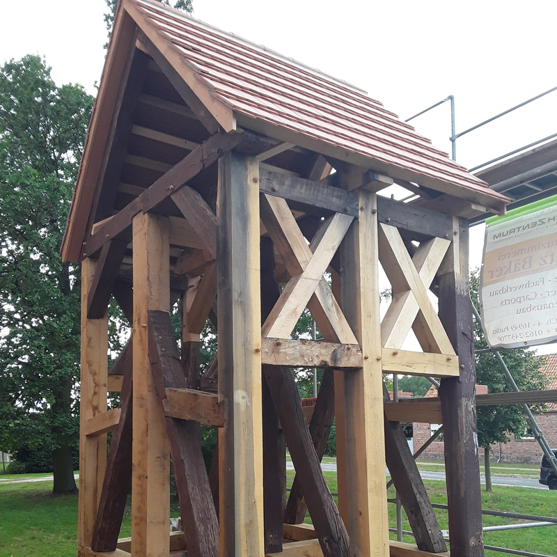 Gleichzeitig wurden die einzelnen Bauteile des Glockenstuhls überprüft, zum Teil durch neue Bauteile ersetzt bzw. Passtücke etc. eingesetzt. Nach Abschluss aller vorbereitenden Maßnahmen wurde der sanierte Glockenstuhl wieder auf die Baustelle geliefert und wiederaufgebaut. Es wurde das Dach eingelattet und mit den gleichen Biberschwanzziegeln des Kirchenschiffs neu eingedeckt.