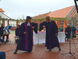 Superintendentin Eva-Maria Menard entpflichtete ihn mit Abschiedsworten, in dem auch sie auf die gemeinsamen Jahre im Kirchenkreis zurückblickte, und auch sein Engagement als Beauftragter für Flucht, Migration und Integration im Kirchenkreis würdigt. Präses Christian Kirsch verlas die Urkunde der Landeskirche mit der er nun "frei von Pflichten sei".