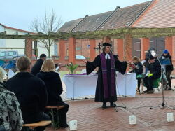 Sechs Jahre hatte Johannes Kölbel den Pfarrsprengel geleitet und griff in seiner Predigt die schönen aber auch traurigen Momente auf - Hochzeiten, Taufen und Feste und natürlich Beerdigungen und bedrückende Begebenheiten. Begleitet wurde der Gottesdienst von den Bläser*innen aus der Region Schwante/Oberkrämer/Vehlefanz.