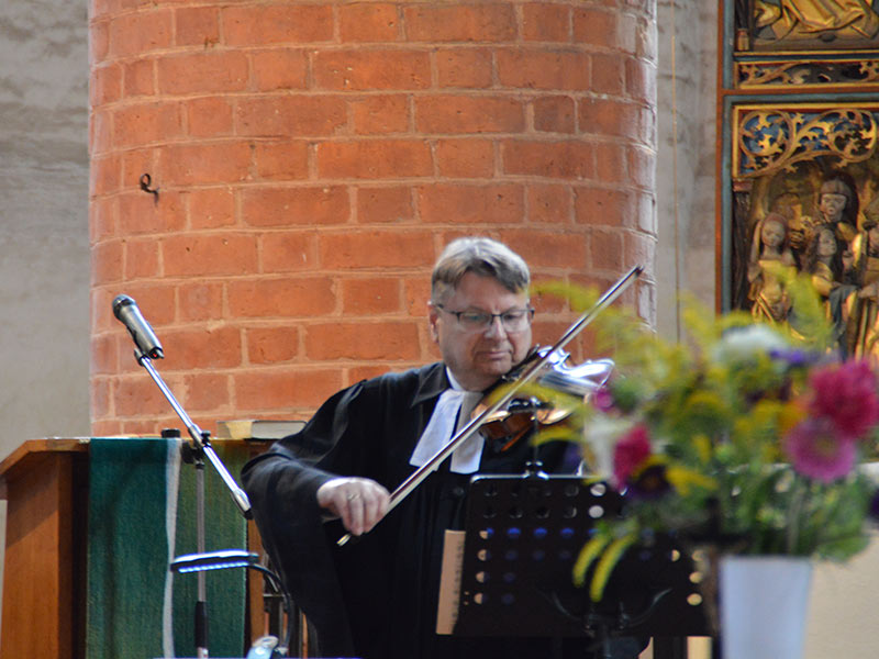 Viele Gemeindeglieder kamen zu diesem letzten Gottesdienst mit Pfarrer Sparre zusammen, und konnten einen musikalischen Gottesdienst genießen. Der Pritzwalker Kirchenchor und die Bläser aus Pritzwalk und anderen Orten gestalteten ihn abwechslungsreich, nicht zuletzt auch durch Pfarrer Sparre selbst, der im Kirchenchor mitsang, und auch zur Geige griff. Zusammen mit Kantor Maxim Burtsev erfreute er die Gemeinde mit einem Duett.