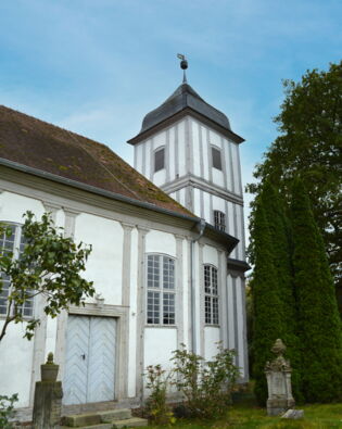 Die Kirche von 1709 ist ein bemerkenswerter Fachwerkbau mit unregelmäßig polygonalem Grundriss und quadratischem, halb eingebauten Westturm mit geschweifter Schieferhaube.
