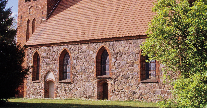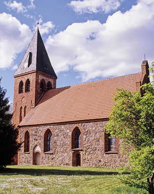 Die mittelalterliche Kirche aus rohen und behauenen Feldsteinen besteht aus einem rechteckigen Saalbau, einer fünfseitigen Apsis und einem quadratischen Westturm. Das Kirchenschiff wurde 1866 unter Verwendung alter Mauerreste stark überbaut, nach Osten erweitert und bedeutend erhöht. Der blendengeschmückte östliche Staffelgiebel und die strebepfeilerbesetzte Apsis sind in Ziegelrohbau errichtet. Original erhalten sind zwei Backsteinportale in der Südwand. 1906 wurde der Turm (Backstein mit Schieferhelm) neu errichtet und das Kirchenschiff nach Westen erweitert.