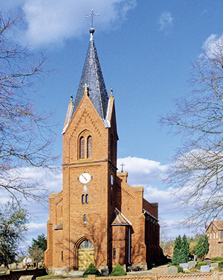 Neugotischer Backsteinbau mit eingezogener polygonaler Apsis und schlankem Westturm von 1883–85. Das Äußere durch Strebepfeiler und Spitzbogenfenster gegliedert. Instandsetzung 1987/88.