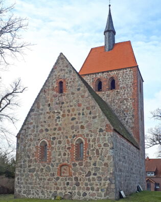 Spätgotischer flachgedeckter Feldsteinbau, das Dachwerk von 1451/52 (d). Mit schiffsbreitem Westquerturm von 1455 (d) und Dachreiter auf dem abgewalmten Turmdach. Die beiden Fenster in der Ostwand, die Schallöffnungen und das Westportal spitzbogig mit Laibungen in Backstein. Die Westseite und die Fenster des Kirchenschiffes 1889 verändert, gleichzeitig die nördliche Turmwand in Backstein ersetzt. Turm und Schiff ursprünglich durch zwei große spitzbogige Öffnungen miteinander verbunden, im 17. Jh. zugesetzt. Instandsetzung des Turmdaches 2005.