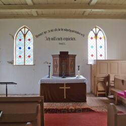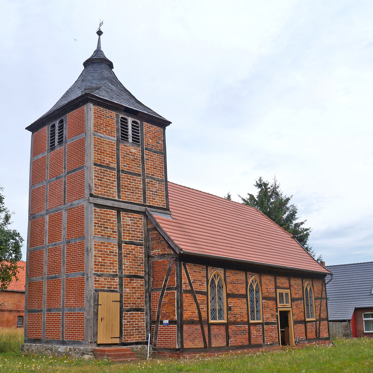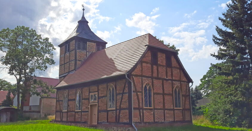 Flachgedeckter Fachwerkbau von 1778 (d), mit steinsichtigen Ausfachungen, Satteldach und ostseitigem Krüppelwalm. Der eingezogene Fachwerkturm von 1800 (d), mit steinsichtigen Ausfachungen und oktogonaler verschieferter Haube. Neugotische spitzbogige Fenster von 1852. Instandsetzung 2012.