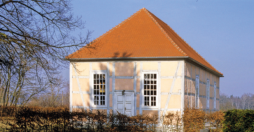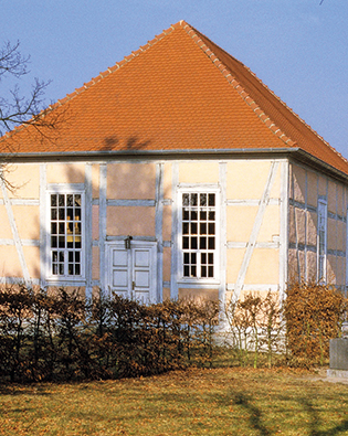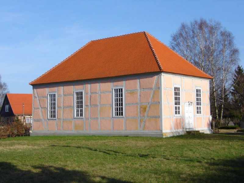 Turmlose, rechteckige barocke Fachwerkkirche mit Walmdach von 1798, die Flachdecke seit 1864 an den vier Seiten von Holzsäulen getragen, die den Wänden innen vorgestellt sind. Unter der Westempore wurde um 1960 eine Winterkirche eingebaut.