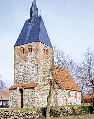 Spätgotischer flachgedeckter Feldsteinbau von 1495 (d). Der etwas schmalere Westquerturm von 1508 (d), mit steilem Walmdach und Dachreiter, verschiefert, die ursprünglichen gekuppelten Schallöffnungen in Backstein, der Glockenstuhl von 1562 (d). Der Ostgiebel des Kirchenschiffes mit stichbogigen Blenden in Backstein, in der Südwand ein zugesetztes spitzbogiges Portal, die Fenster nachträglich verändert. Instandsetzung 2001, Fugensanierung 2016.