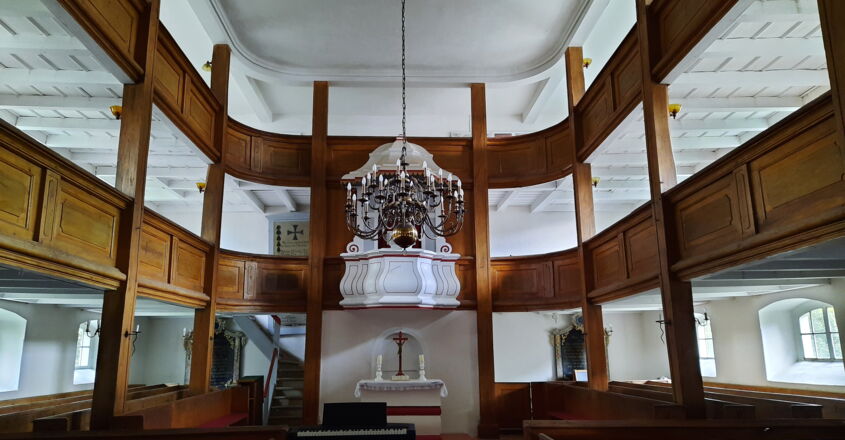 Eindrucksvoller, einheitlich ausgestatteter Innenraum; ringsum laufende doppelgeschossige Emporen, 1774 mit eichenholzfarbenem Anstrich versehen. In die untere Empore sind die bauchig geschwungene Kanzel im Osten und die trapezförmig vorgezogene Orgelempore im Westen einbezogen. Die Orgel wurde 1913 in der Werkstatt der Gebrüder Dinse, Berlin gebaut, das Gehäuse von Gottlieb Scholtze, Neuruppin, 1752. Rokoko-Orgelprospekt, datiert 1752.