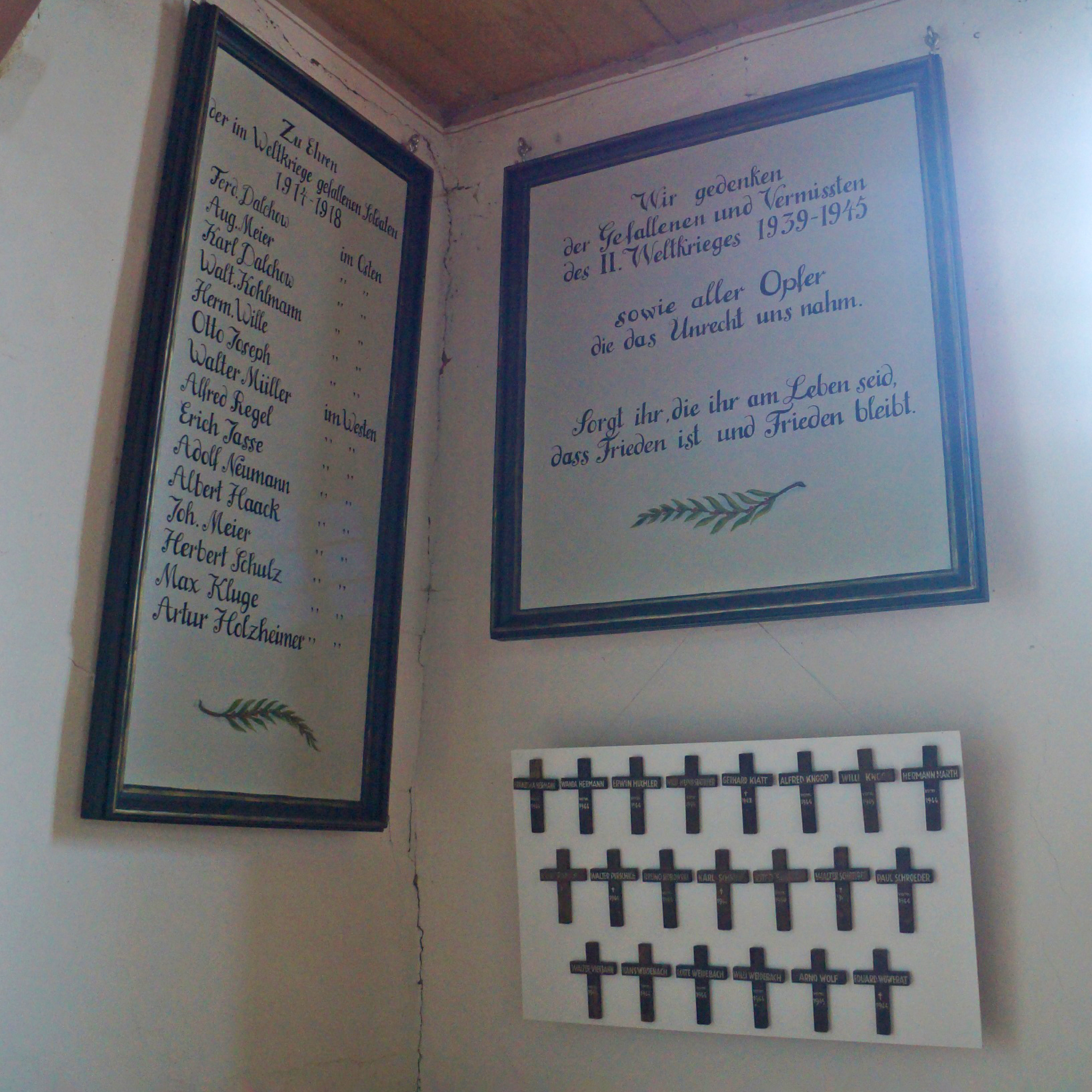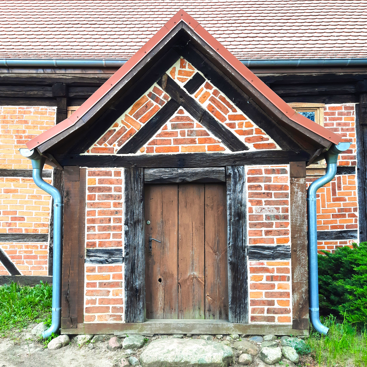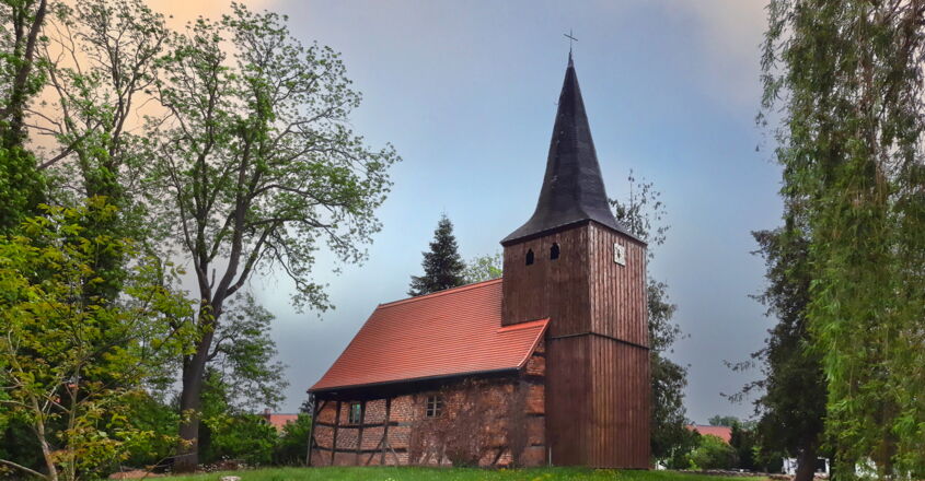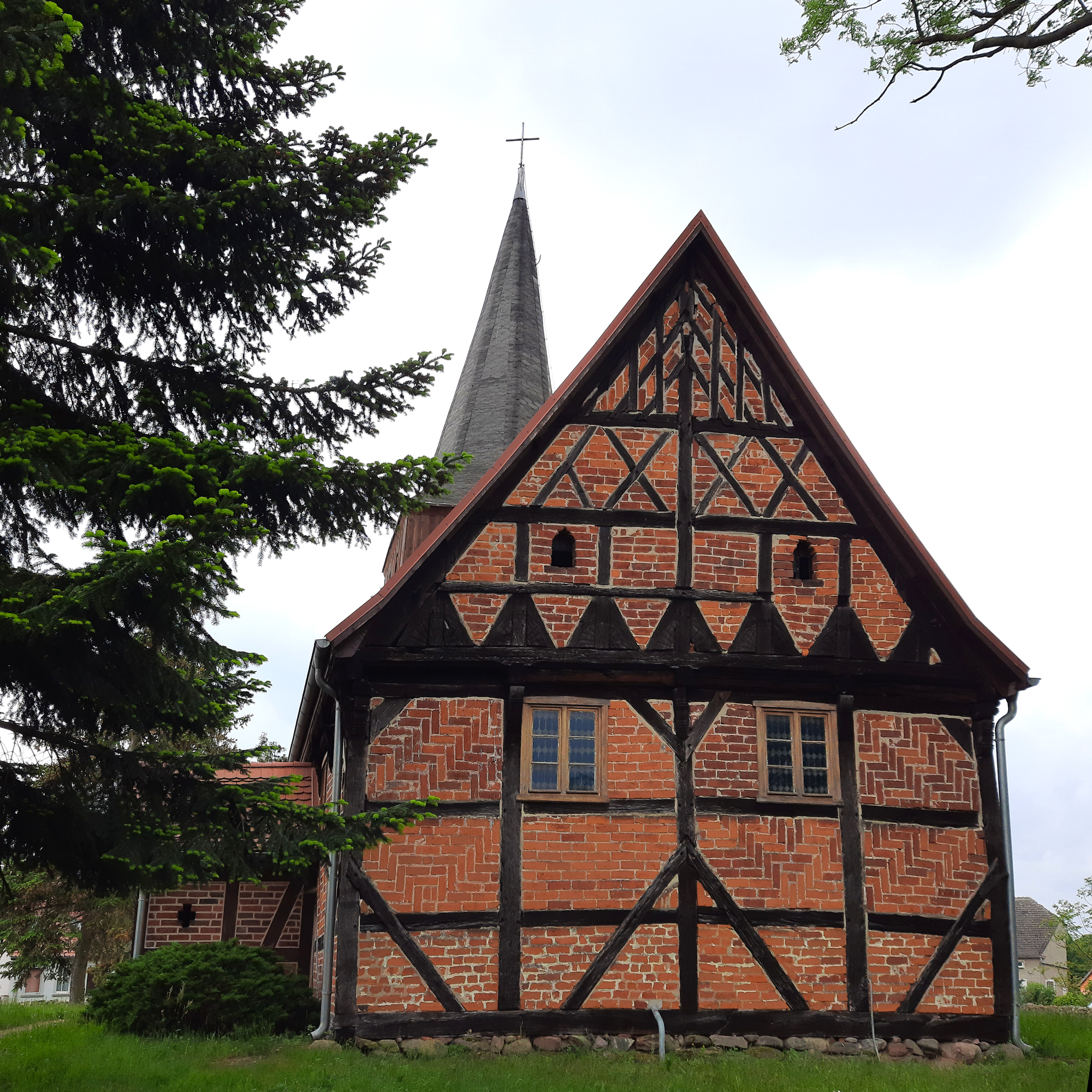 Fachwerkbau mit bauzeitlich eingebundenem verbrettertem Fachwerkturm von 1576 (d). Das Kirchenschiff mit geblatteten Streben, kerbschnittverzierten Knaggen und ziegelsichtigen Zierausfachungen. Der Ostgiebel in aufwendiger Gestaltung, die untere Zone mit rosettenverzierten dreieckigen Fußstreben, darüber Andreaskreuze. Im Giebelzwickel angeblattete Schmuckverstrebung. Die Giebelschwelle mit Resten einer herausgearbeiteten, nicht mehr lesbaren, dokumentierten Inschrift von 1577. Südvor-Halle mit Inschrift auf dem Türbalken von 1750. Instandsetzungen 1993–95.