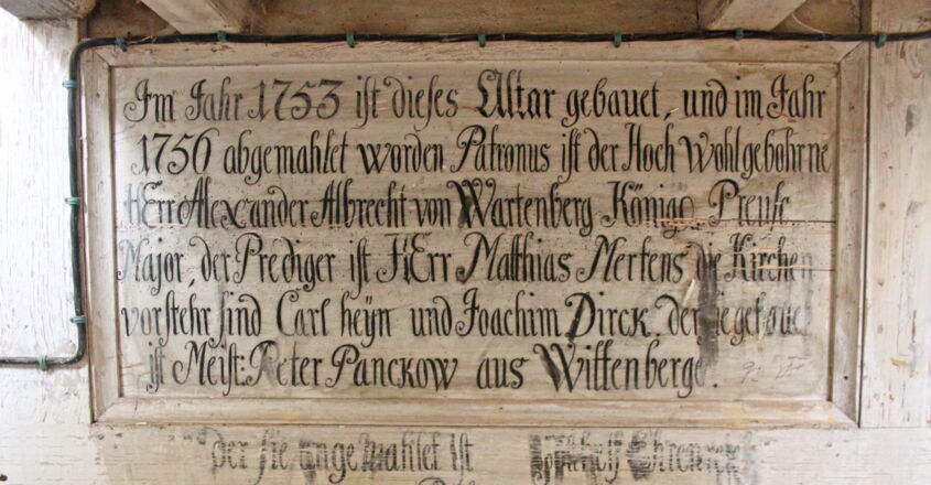 Innen hölzerner Kanzelaltar von 1753 mit seitlichem Betstübchen, 1756 (i) bemalt. Geschnitzter Sakramentsturm um 1502. In der Turmhalle Grabplatte für den 1308 verstorbenen Friedrich von Wartenberg, restauriert 2011/12.